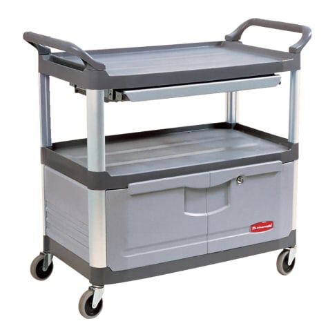 This gray instrument cart features durable polyethylene construction with a convenient sliding drawer under the top shelf and lockable doors on the bottom shelf to keep instruments secure. The shelves on this cart are smooth and easy to clean, and the large, non‐marking casters are gentle on your floor.