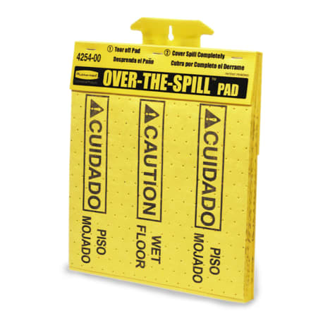 This Over‐the‐Spill 25‐pad tablet is the most effective way to deal immediately with spills, featuring a corrugated plastic backing that mounts on any flat surface or hangs from floor caution signs to ensure that its highly absorbent pads are always nearby. Each tear‐off pad in this tablet absorbs up to 12 of fluid for faster clean‐up while also covering spilled liquids and alerting pedestrians with their bright Yellow color. The pads are made of strong, melt‐blown polypropylene that is also slip‐resistant, and each pad has the universal caution symbol and the message "Caution Wet Floor" in English and Spanish.