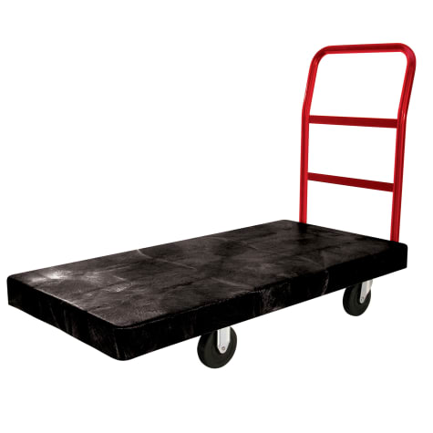 This black heavy duty 48" x 24" platform truck with one crossbar handle features extra‐tough 8" polyolefin casters and durable structural foam construction that will not rust, dent, chip, peel or splinter. It can hold up to 2000 lbs. and is virtually maintenance‐free.