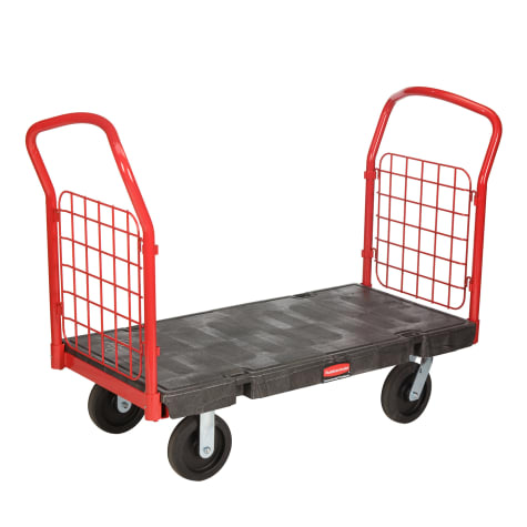 This side panel platform truck from Rubbermaid is ideal for transporting and retaining small packages and materials. The heavy‐duty powder‐coated wire side panels keeps small items in the platform truck. It also features molded‐in tie down slots for load security and the textured deck surface reduces load slippage. This side panel platform truck is 24" x 48" and has 2 fixed and 2 swivel casters for optimal control and maneuverability.