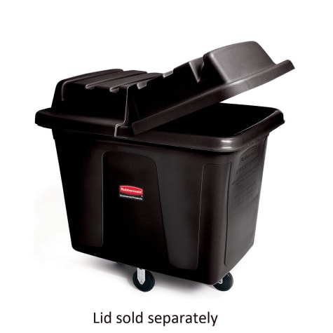 This black 12 cubic foot cube truck features a durable, rotational molded polyethylene body and a metal frame for extra support, making it good for waste collection, material transport, laundry handling and a wide variety of other tasks. When combined with the matching domed lid, you can conceal loads without reducing the truck's capacity. This truck also features diamond wheel placement for better maneuverability.