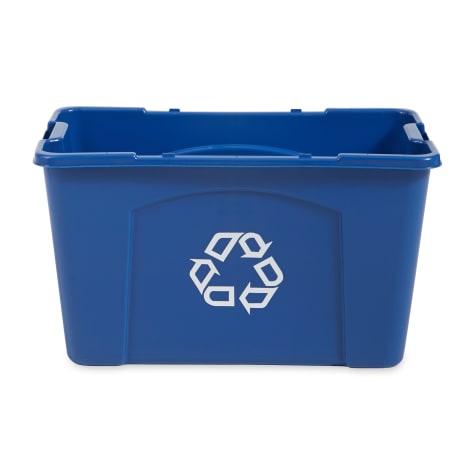 This Rubbermaid recycling bin has an 18 gallon capacity. Use for recycling cans, bottles or paper. It has the white Recycling logo on the side.