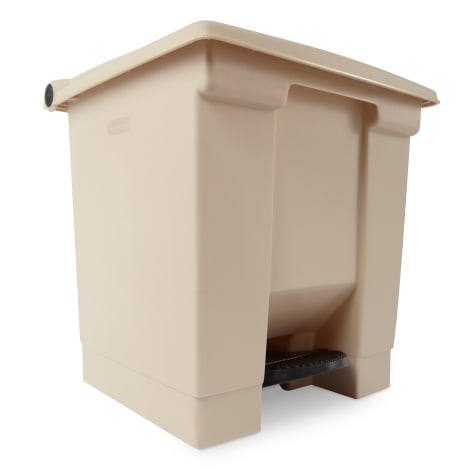 This beige 8 Gal step‐on waste container features a puncture‐resistant, all‐plastic construction with a quiet, heavy‐duty foot pedal for sanitary hands‐free use. Its tight‐fitting, overlapping lid also helps contain odors. This container is fire‐safe and helps comply with OSHA health regulations.