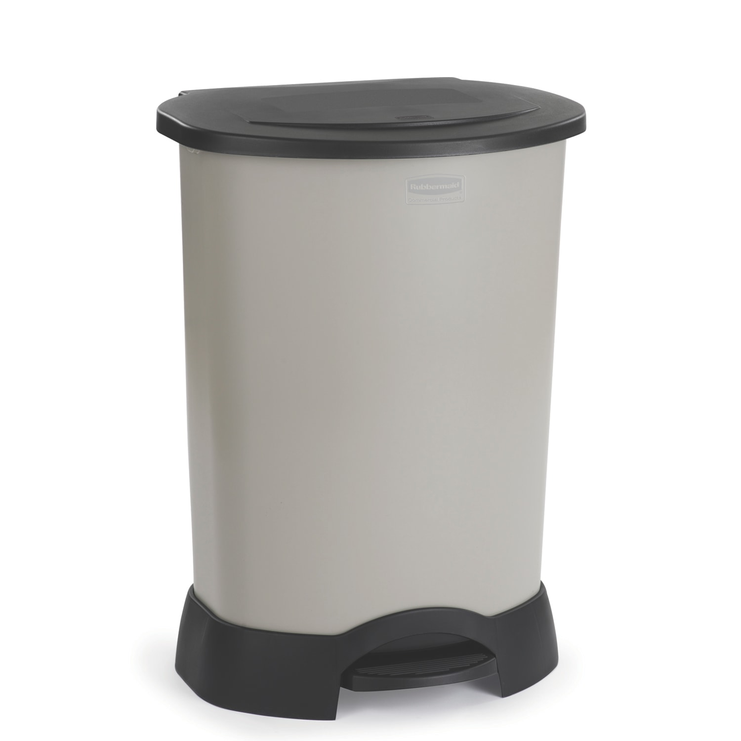 This Rubbermaid® 30 gallon step-on container is light platinum in color and has a pedal operated, slow-closing, integrated lid. The lid fits tightly to keep odors and germs inside and the foot pedal provides hands-free operation.