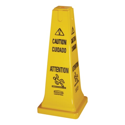 This low 4‐sided 26" safety cone is made of durable, highly visible plastic fabric and features both a universal wet floor symbol and the word "caution" in English, French and Spanish. It has molded‐in slots for easy handling and a versatile top hole that can accommodate a barricade belt, flashing warning light or lock‐in sign holder. The square shape of this cone lets it stack for easy storage and fits on the 3530 square BRUTE™ dolly for convenient transport.