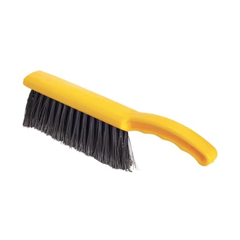 This 12" counter brush features silver flagged polypropylene bristles and a yellow plastic handle block. It is good for general-purpose cleanup use.