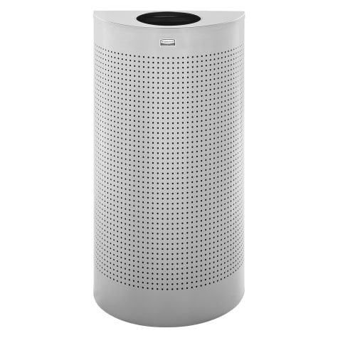 This indoor receptacle from Rubbermaid features sleek lines and a graphic pattern that will add a modern look to any room. This half round shape receptacle has a capacity of 12 gallons and features a silver metallic color and an open top. The lift‐off body facilitates emptying of the leak‐proof rigid plastic liner.