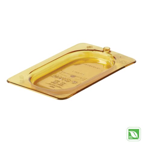 These Rubbermaid lids are break resistant and won't rust or bend. The microwave and dishwasher safe pans feature a non‐stick surface. The lids are designed for use between ‐40°F to 375°F (‐40°C to 109°C), but they are cooler to the touch than metal. The peg hole is used for saving space while the lid hang dries. The cold food pan lid meets the C.E.N. Gastronorm specification 631‐1 developed by the European Committee for Standardization. The Rubbermaid cold food pan lid is made of FDA compliant material and is certified to NSF Std. #2. Amber color for visible recognition of hot container.
