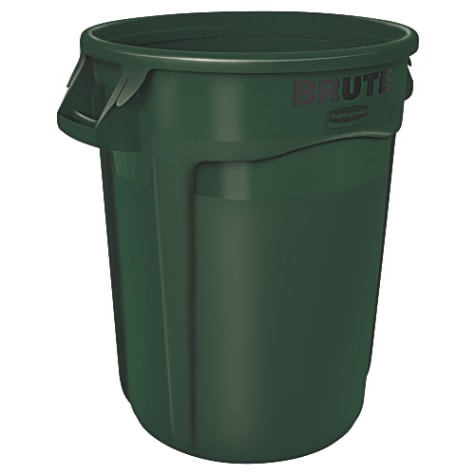 This dark green 32 gallon container without lid features the renowned durability of the BRUTE™ line, with all‐plastic professional‐grade construction that will not rust, chip, peel and resists dents. It has reinforced rims for added strength, built‐in handles that make carrying easy and prevent jamming when nesting, and a double‐ribbed base that increases stability and dragging capacity. No container is more versatile.