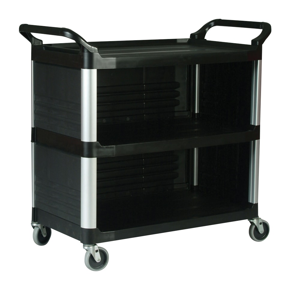 This black 3‐shelf utility cart features durable polyethylene construction and large shelves for carrying lots of equipment and supplies. It also has three enclosed sides to conceal objects and help keep them from falling off the middle and bottom shelves.