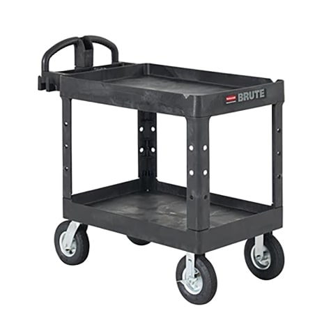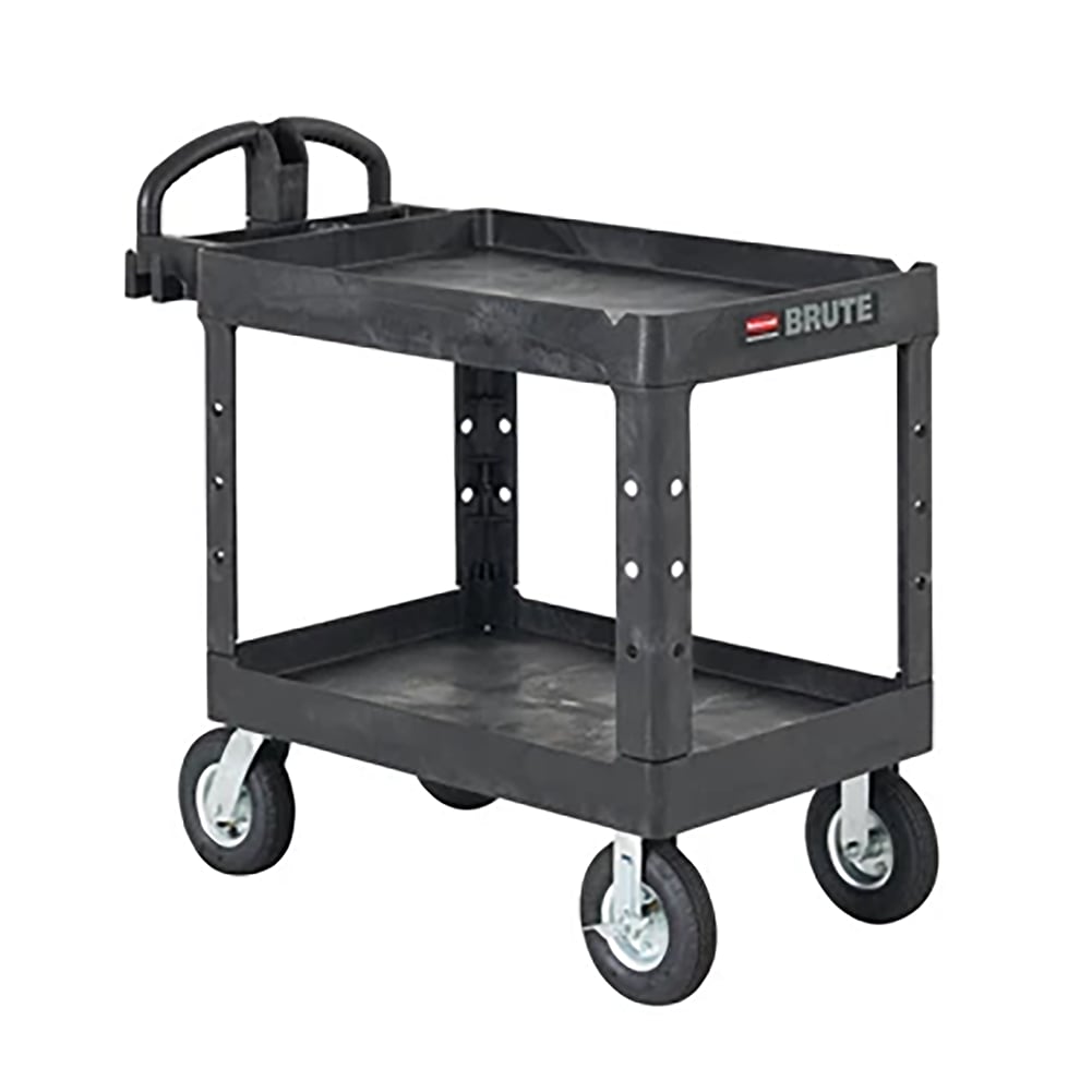 This black 2‐shelf utility cart features sturdy, lightweight structural foam construction that won't rust, chip, dent or peel, making it good for use in any work environment. It's rounded corners protect your wall and furniture, and its extra‐large, non‐marking pneumatic casters are easy on your floor and give the cart good maneuverability. Ergonomically designed push handle provides optimum hand placement and push height improving control and worker safety.