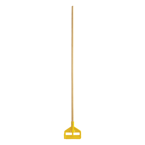 This 60" wet mop handle features a sturdy wooden body and the Invader side gate head that makes changing mop heads fast and easy. Just turn the thumb wheel on the yellow plastic head to release your old mop head, then tighten the wheel to securely clamp a new one on. This handle is designed for use with mop heads with 1" headbands only.