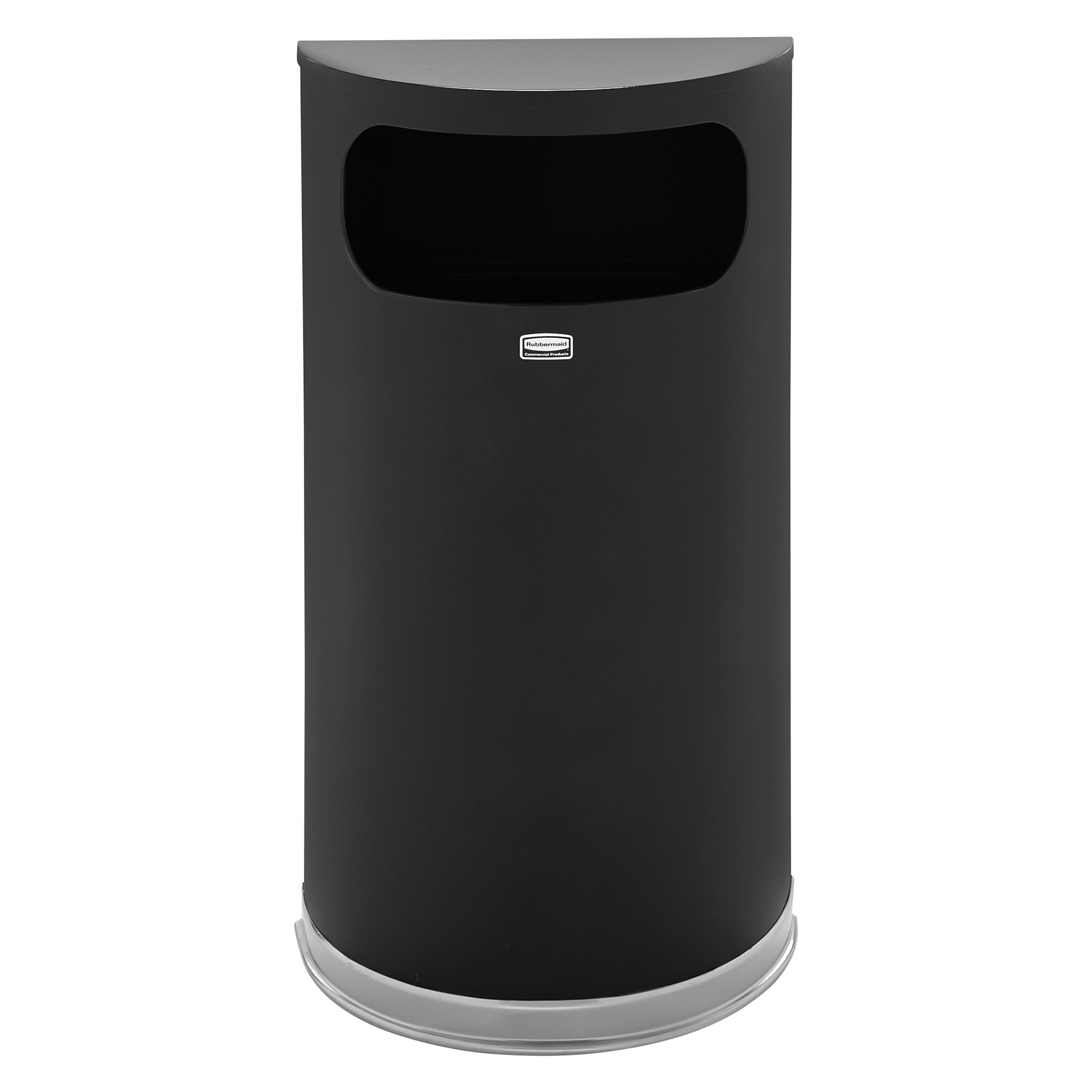 This 9 gallon trash container has a half‐round shape that fits flush against any wall to save you space and a large trash disposal opening to encourage use. It features steel construction with a powder coated black finish and a lift‐off design that gives you easy access to the included leak‐proof rigid plastic liner. This container also comes with a base ring to protect your floors.