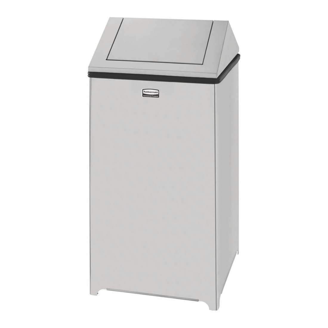 This square 40 gallon trash container features dual push doors and a full length piano hinge that connects the top to the base, plus steel guide rods to hold the top open at 90° for easy servicing.