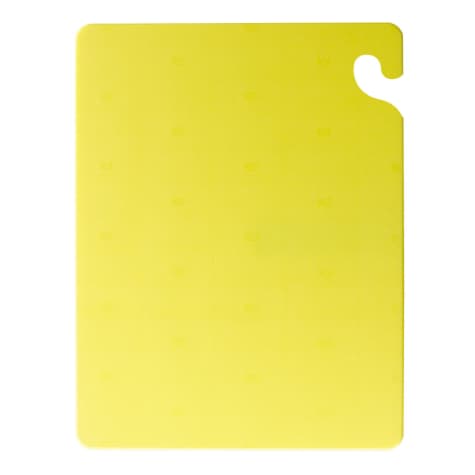 This San Jamar® Cut-N-Carry® Cutting Board comes in a yellow color and is made from a co-polymer blend. It resists cut-grooving to prevent the dulling of knives, and has a patented Food Safety Hook for safe storage.