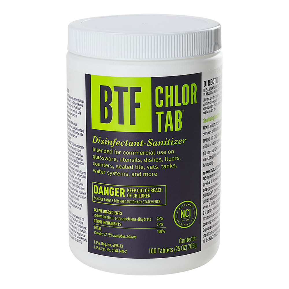 BTF Chlor-Tab sanitizes bar and restaurant glassware. Meets health codes with only 1 tablet per standard bar sink. Leaves no residue, taste, or odor behind that could affect the carbonation in beverages such as beer, wine, or soda. Use with detergents to get a beer ready glass each time! Includes water conditioning chemicals - no need for an additional mineral solvent. Also cleans yogurt, shake, slush, and other soft-serve equipment.