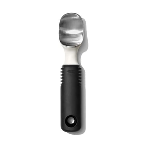 Serve up cone after cone with ease with this OXO Classic ice cream scoop. The pointed design and comfortable grip of this OXO Good Grips ice cream scoop allows you to glide right through sorbet, frozen yogurt and ice cream. The flat edges let you get every last bit of ice cream and the non‐slip grip is comfortable. The stainless steel head will not chip, pit or discolor.