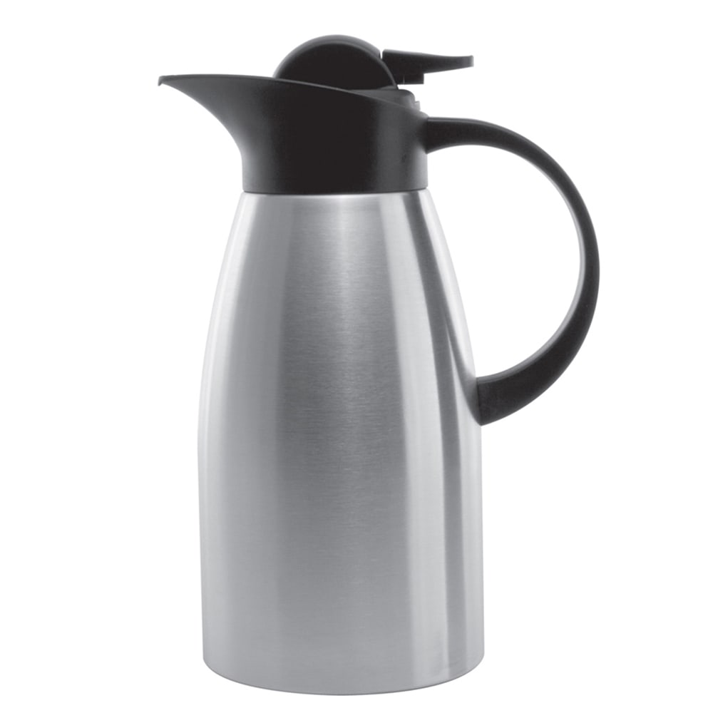 This Service Ideas stainless steel Touch server features a push‐button plastic lid, which allows liquid to pour under it ‐ not through it ‐ creating a more sanitary server.