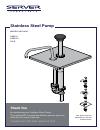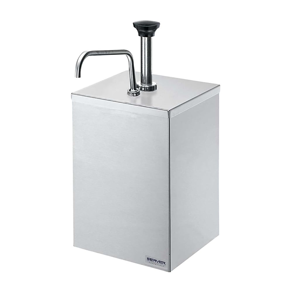 This stainless steel pump with shroud dispenses directly from a #10 can, 3 quart (2.8 L) stainless steel jar 94009 or 1 gallon (3.8 L) jar. The pump dispenses 1 ounce (30 mL) per stroke with the option to reduce portions in 1/8 ounce (3.7 mL) increments, using the supplied gauging collars.