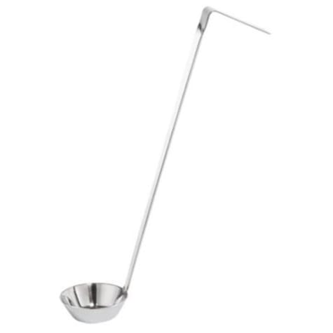 This long (10", 25.4cm) ladle is constructed of stainless steel and has a capacity of 1 oz (30 mL).