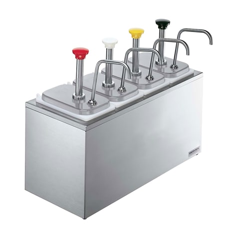 This insulated bar combo features stainless steel pumps that can dispense thick products with particulates, which typically require chilling. This model includes four stainless steel pumps and deep plastic fountain jars. The brushed finish base reduces the visibility of fingerprints and may be cooled with Universal Ice Packs 100515, HoldCold Jars or ice. Ice packs and HoldCold jars are sold separately.The stainless steel pumps dispense a 1 1/4 oz (37 mL) serving per stroke with the option to reduce the portion size in 1/8 oz (3.7 mL) increments, using the supplied gauging collars. Black knobs are standard.