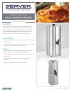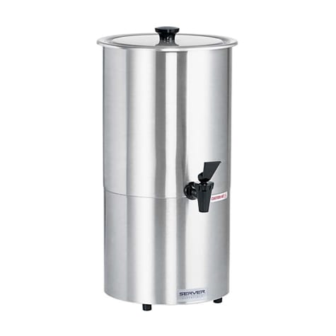 The Syrup Server is constructed of stainless steel. The product vessel and lift-off lid are also stainless steel. A traditional spigot style faucet is made of durable black plastic. Its compact design takes up a minimal amount of counter space with a 3 gallon capacity.