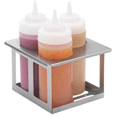 Designed for cold table use, this holder makes everything from sandwich dressing to dessert drizzle convenient and efficient. The lid holds bottles upright and keeps cold table refrigeration from escaping; occupies the space of a 1/6-size food pan. Incudes (3) 16 oz TableCraft squeeze bottles, insulated base sold separately.