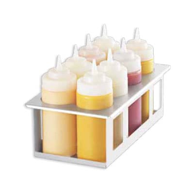 Designed for use in a cold table to make sandwich dressing convenient and efficient. The lid holds bottles upright and keeps cold table refrigeration from escaping; occupies the same space as a 1/3-size food pan. Includes (8) 16 oz TableCraft squeeze bottles.
