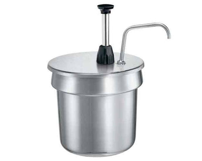 This stainless steel pump dispenses larger portions of thick condiments and thicker sauces from a 7 quart vegetable inset in a heated or chilled food table. A full portion for this model is 2 oz and can be reduced to serve 1 3/4, 1 1/2 and 1 1/4 oz with the included portion collars.