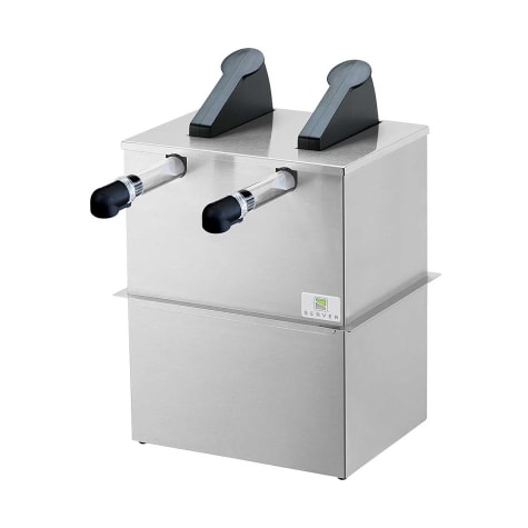 Server Express multiples are constructed of a brush finish stainless steel base and lid with surgical‐quality plastic pumps. Dispensing levers are black polypropylene. The capacity is 1‐1/2 gallons per pouch and the pumps yields 1 oz per stroke with portion control to reduce the yield in 1/4 oz. increments. The Server Express exclusively uses Cryovac pouches with 16mm fitment and achieves up to 98% evacuation. NOTE: Unit should NOT be used for bag of Nacho Cheese. Intended for non‐potentially hazardous product, served at ambient temperature. Aseptically packaged cheese (shelf‐stable) is not generally available in 1.5 gallon pouch with 16mm fitment.