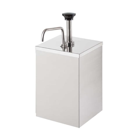 This stainless steel pump with shroud dispenses directly from a #10 can, 3 Qt. (2.8L) stainless steel jar 94009 or 1 gallon jar. The pump dispenses 1 oz (30 mL) per stroke with the option to reduce portions in 1/8 oz (3.7 mL) increments, using the supplied gauging collars. Colored, engraved knob to identify contents is available upon order; black is standard