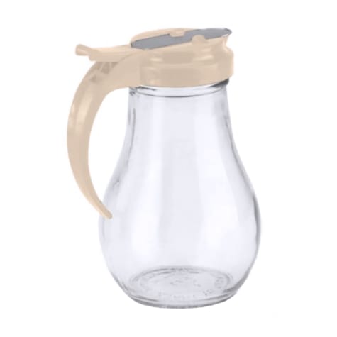 Versatile is the perfect description for the Vollrath Dripcut server. Ideal for serving syrup, dressing, or sauces. The clear glass jar allows easy identification of contents and so you can tell when it is time to refill. It comes with a plastic top in an attractive almond color, so it blends easily with other serving items.