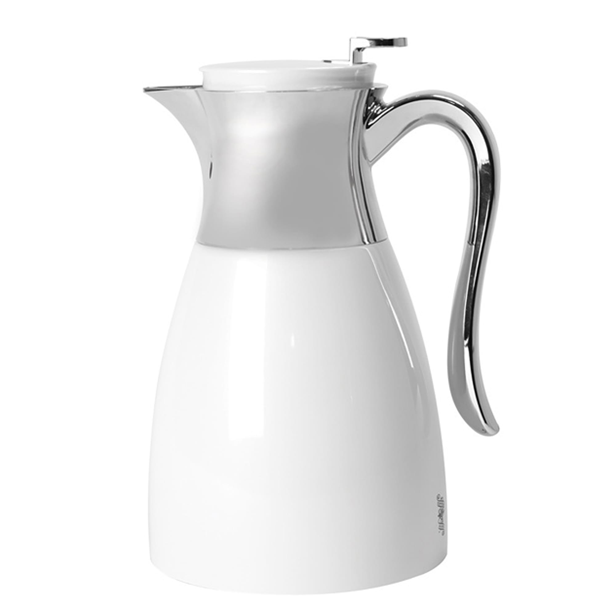 This Service Ideas Elegant Server has a 1 liter capacity and is vacuum insulated to keep beverages hot for 4-6 hours. It is made from chrome plated stainless steel, and comes in a white color with mirrored accents.
