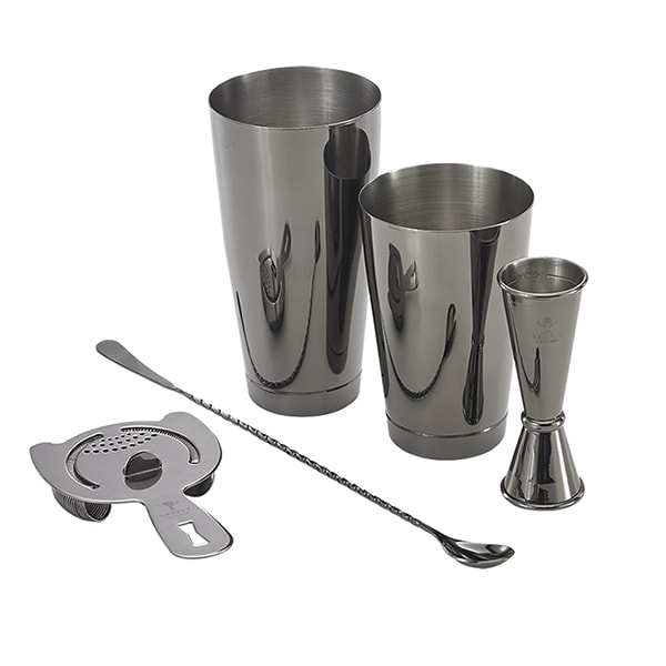 One convenient kit that has the key components for a basic bar set up, and that includes the staples needed by every barman. This set has an antique copper finish.