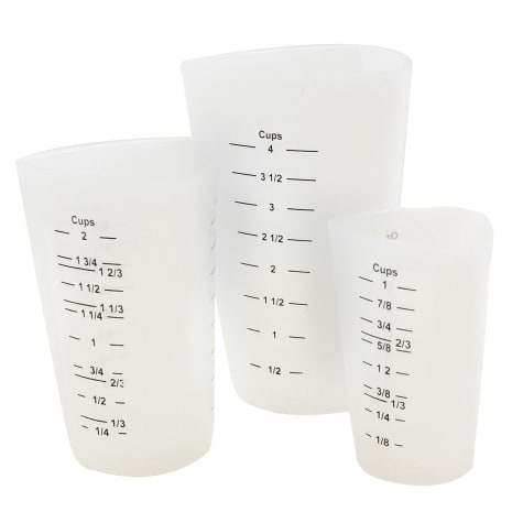 This flexible measuring cup set from TableCraft features durable silicone construction. This set includes three measuring cups ‐ 1 cup, 2 cup and 4 cup capacities.