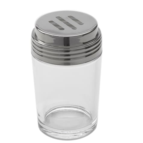 This cheese shaker from American Metalcraft features a slotted stainless steel top and has a capacity of 6 ounces. This glass shaker offers a contemporary look and is perfect for restaurants.