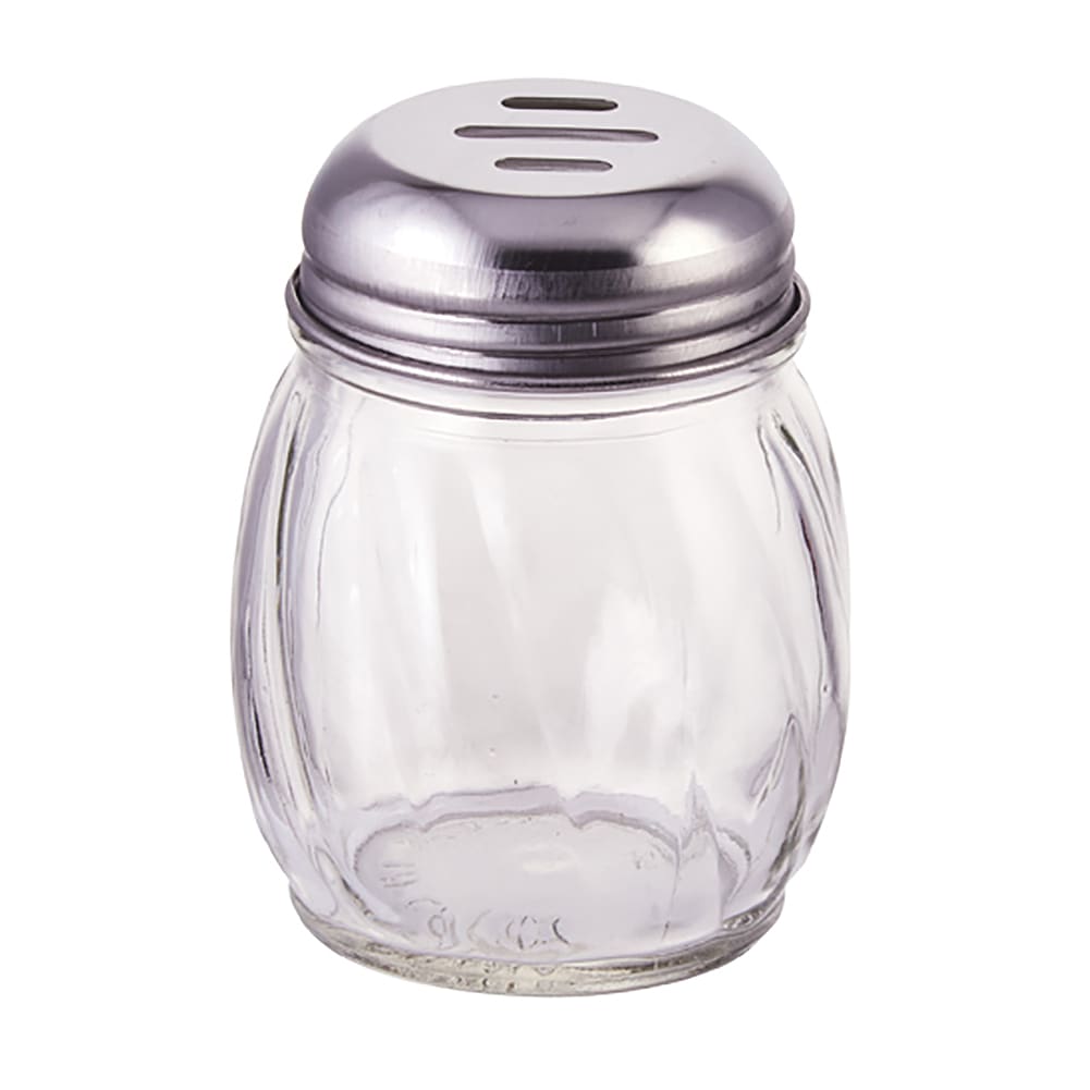 This 6 ounce glass cheese shaker from Winco® features a slotted top and is perfect for restaurants or pizza shops!