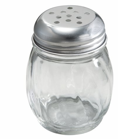 This 6 ounce glass cheese shaker from Winco® features a perforated top and is perfect for restaurants or pizza shops.