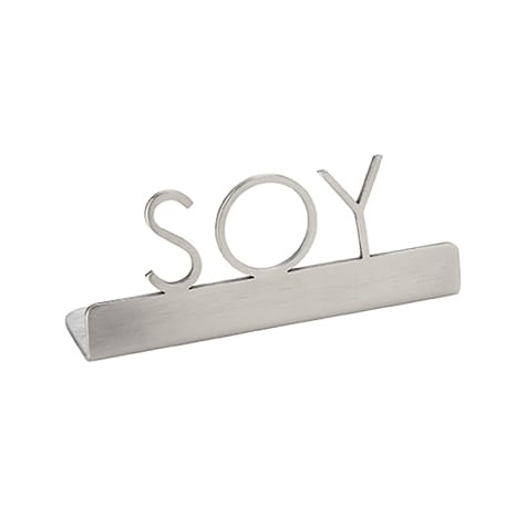 This stainless steel table tent sign is designed to clearly indicate soy milk at self-serve stations. Measuring 3 inches in length, 3/4 inches in width, and 1-1/4 inches in height, it features a minimalist design with the word "Soy" laser-cut for easy identification. Its sleek and durable construction makes it a practical and stylish addition to any coffee station or buffet.