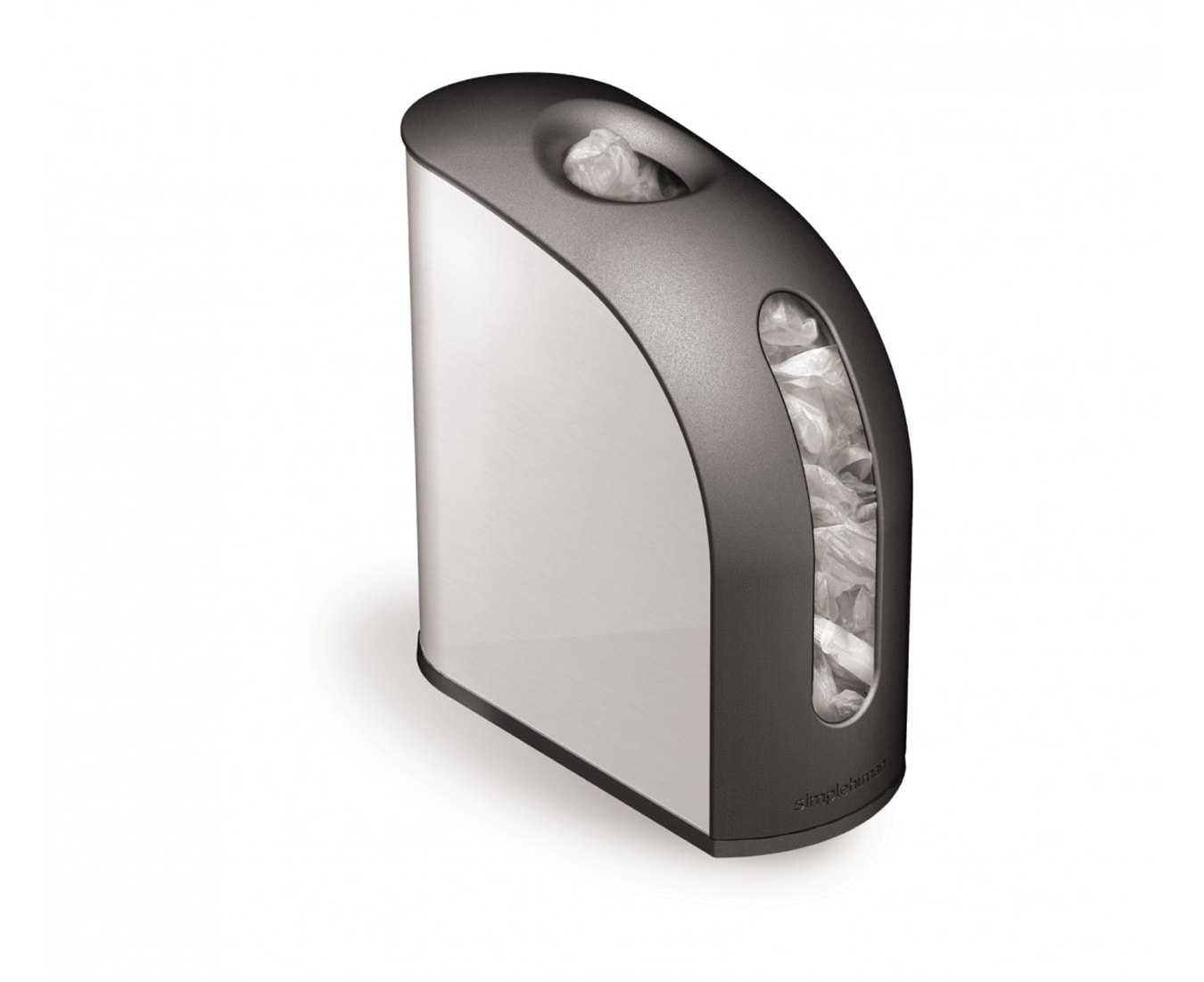 This simplehuman® upright grocery bag holder has a slim shape that fits nicely on the counter or in a cabinet. It holds up to 50 plastic grocery bags.