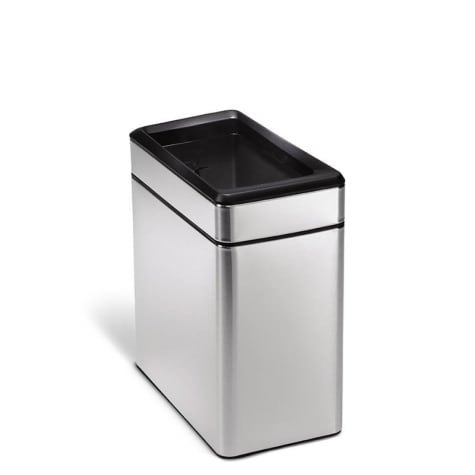 This open trash can from simplehuman features a compact size and slim profile that makes it perfect for use in a bathroom or under a desk. The lift-off lid and removable inner bucket allow for a quick and easy bag change.
