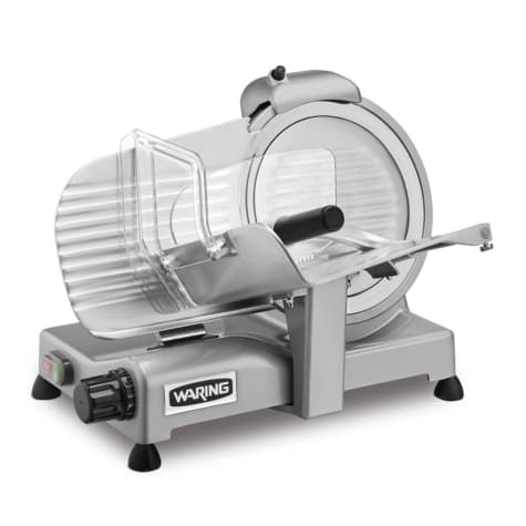 This Waring Commercial food slicer has a 3/4 HP motor and a 10" tempered, hard chrome blade that can perform a variety of slicing tasks. The sturdy base and tilt‐out carriage makes it easy to operate and clean.
