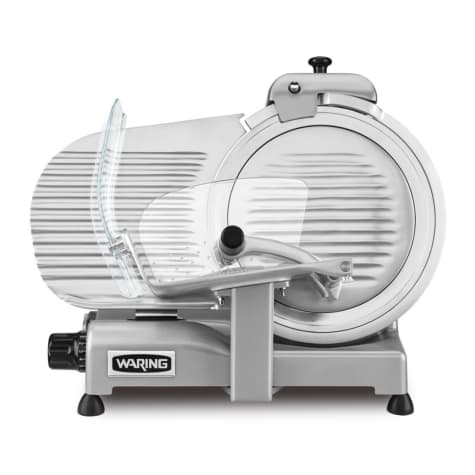 This Waring Commercial food slicer has a 3/4 HP motor and a 8.5" tempered, hard chrome blade that can perform a variety of slicing tasks. The sturdy base and tilt‐out carriage makes it easy to operate and clean.
