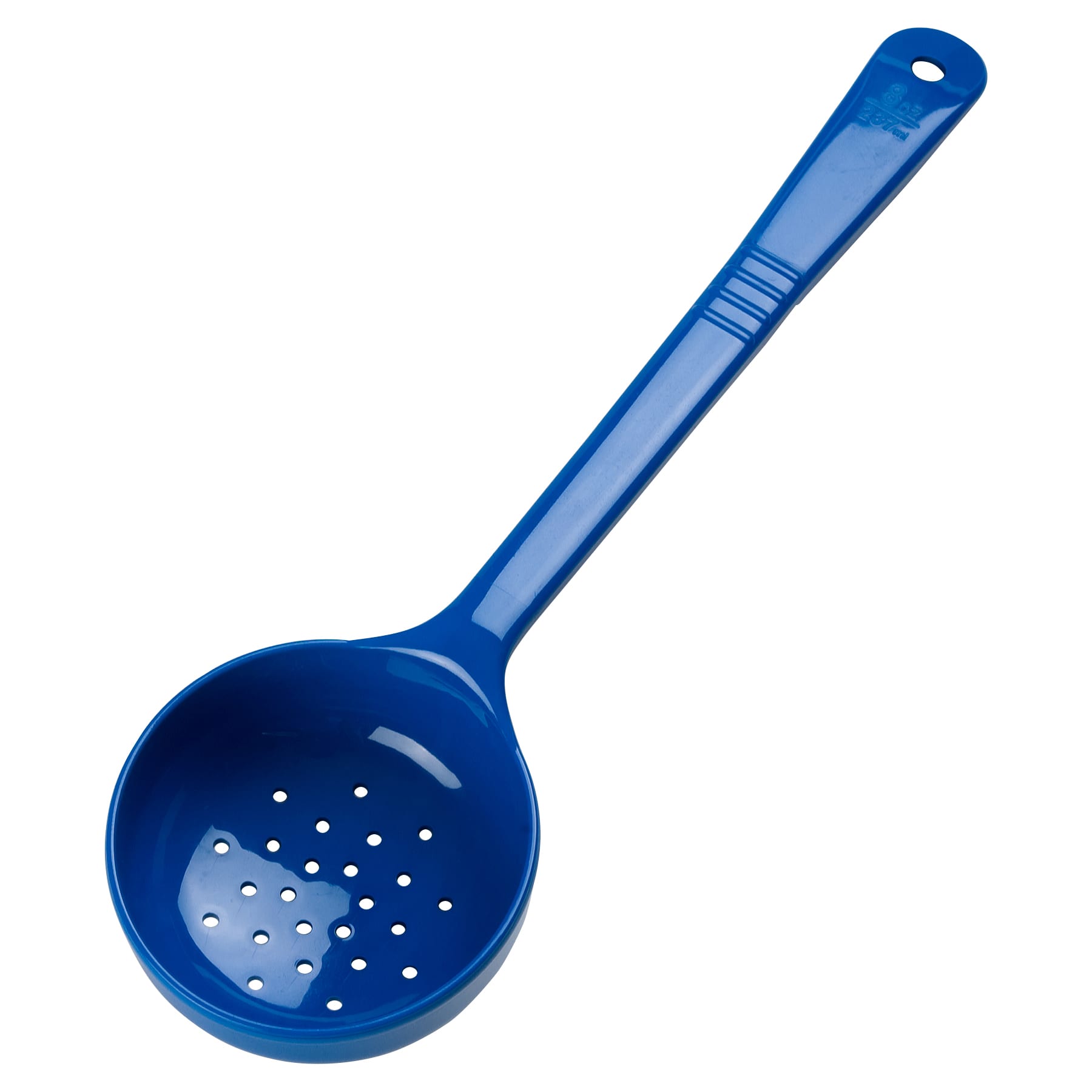 This Measure Miser® perforated spoon from Carlisle® has a long handle and has a capacity of 8 ounces. A flat bottom allows for easy spreading.