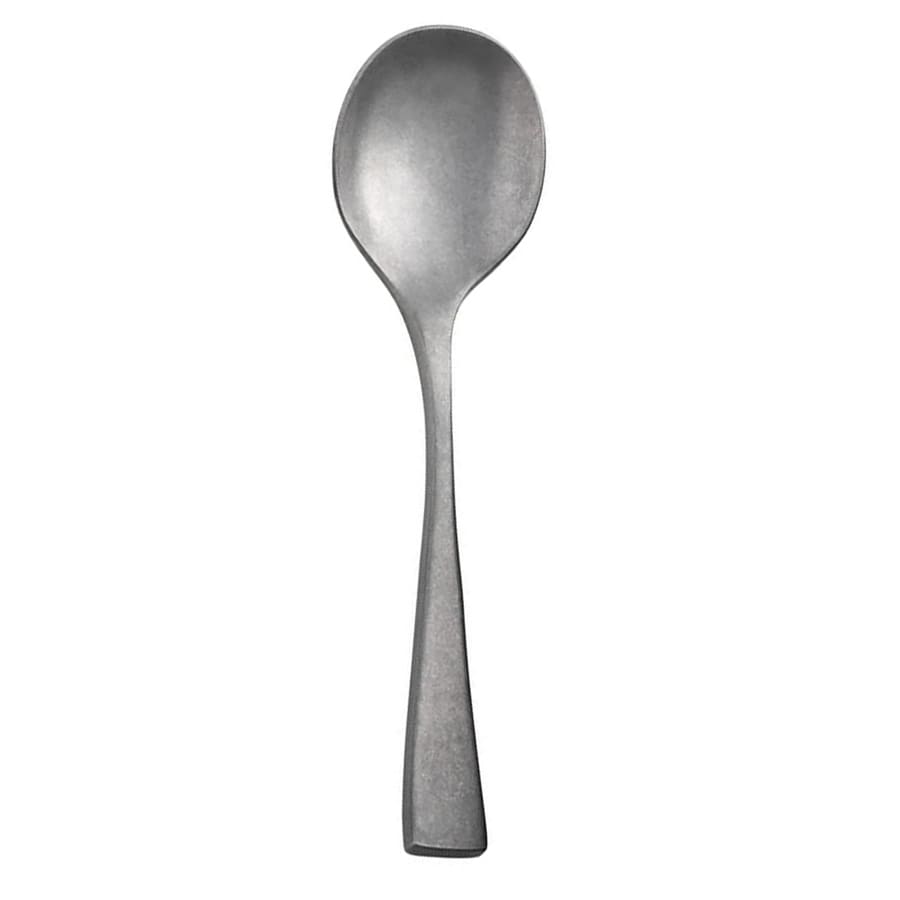 This Lexia bouillon spoon features contemporary curves enhanced by the 1880 Hospitality Relic finish. The trademark finish provides a weathered and organic look that provides a sophisticated appeal to this heavy weight pattern.