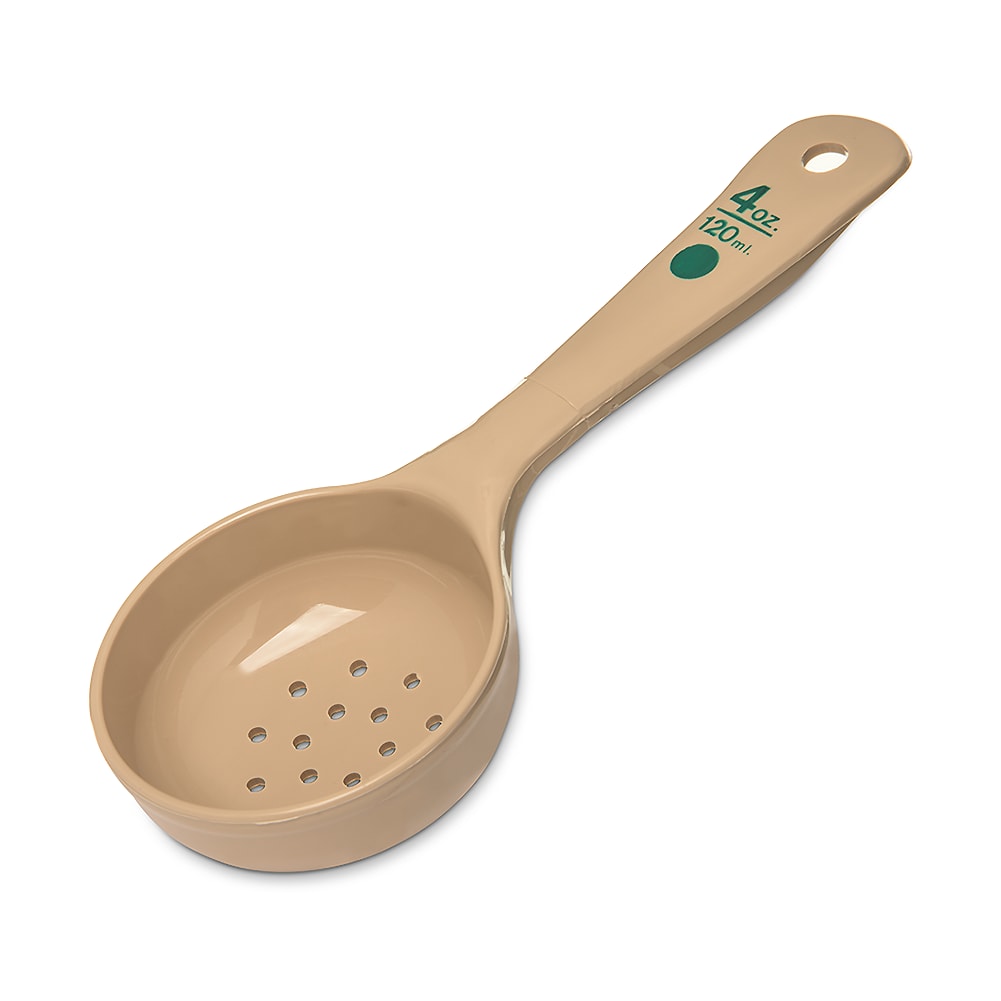 Achieve perfect portion control with this 4 oz. perforated portion server which is crafted from durable, break-resistant polycarbonate, ensuring long-lasting performance in busy kitchens. Its perforated design efficiently drains liquids, making it ideal for vegetables, toppings, and sauces. Featuring a short, ergonomic handle with a thumb grip for comfort and control, this NSF-certified utensil is dishwasher safe for easy cleanup. This is the ultimate tool for consistent servings and streamlined food prep.