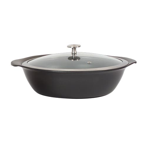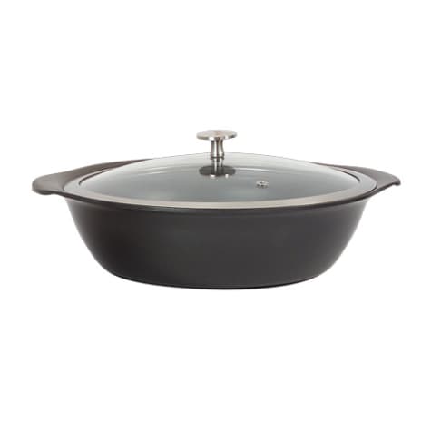 This Spring USA® Motif Casserole Pan is made from aluminum and comes in a titanium color. It is safe for all heat sources and has a non‐stick design. This pan includes a vented, tempered glass lid.