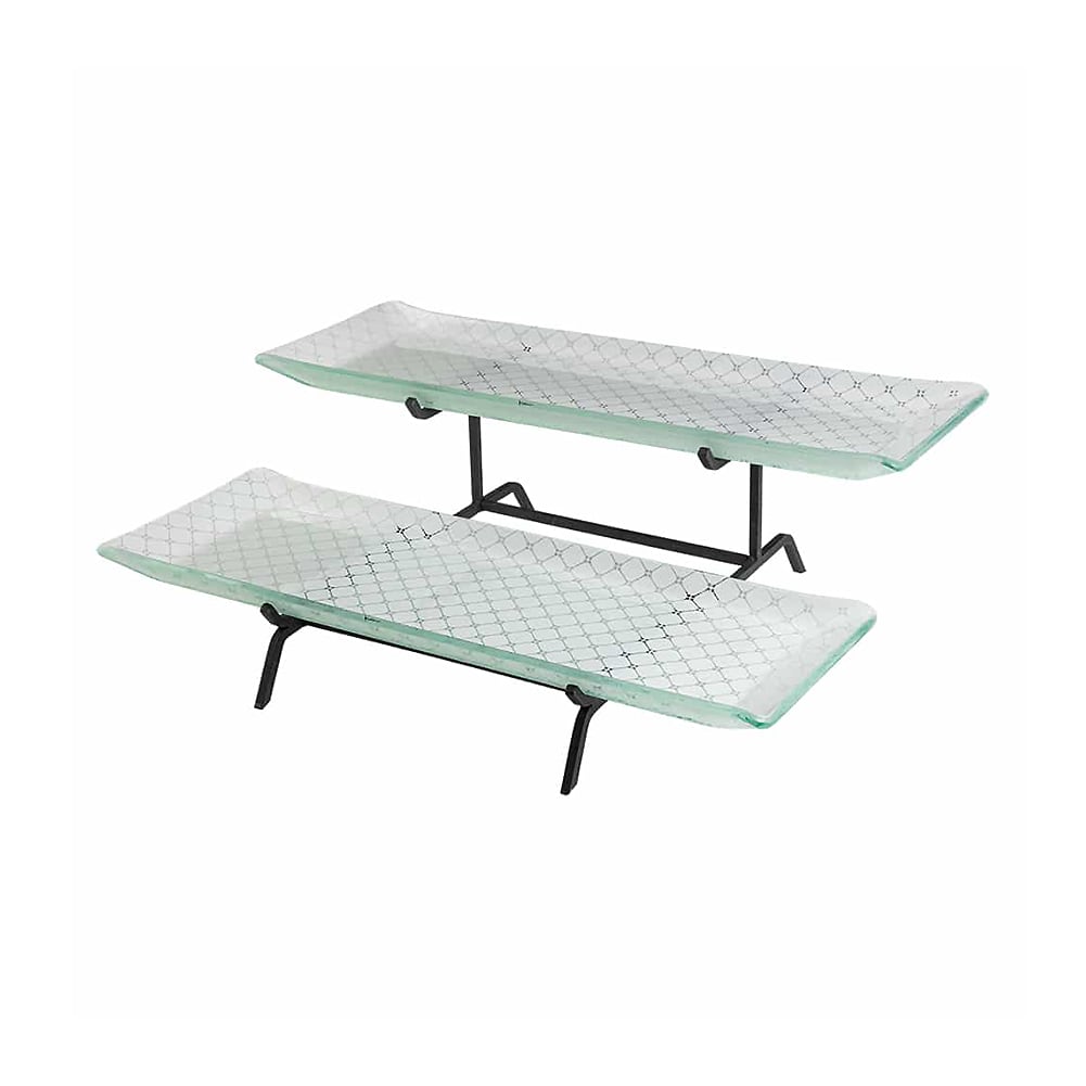 This elegant 2-tier display stand will be sure to elevate your culinary presentation! Measuring 22.5" x 15.75" x 7", this stand from Rosseto includes two Zenit white rectangular glass platters, perfect for showcasing hors d'oeuvres, desserts, or signature dishes. The stand is crafted from durable black metal, and integrates seamlessly with Rosseto Skycap® and Multi-Chef™ Systems, offering versatility and style. Both platters are dishwasher and microwave safe, ensuring easy maintenance. Ideal for catering events, restaurants, or home gatherings, this display combines functionality with an artful presentation.