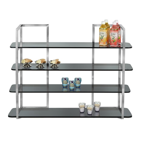 This stainless steel riser from Eastern Tabletop can be used in a variety of combinations. This unit includes 4 black glass shelves and is perfect for back bar displays and buffet setups!