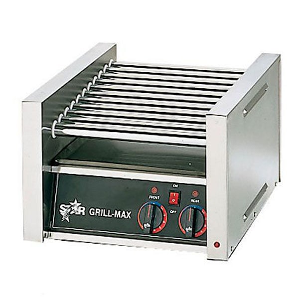 This Star® Grill‐Max® Roller Grill has a 20‐dog capacity and features an exclusive heavy‐duty roller bearing design for smoother operation and minimal grease‐free maintenance. Its analog control fits any operation, and its slim design offers maximum grill space with a small footprint. It has an angled configuration for the best product presentation.